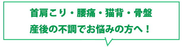産後の骨盤矯正や生理痛など、女性に多い産前・産後のお悩みを根本から見直して改善していきます!また、姿勢や体型に関するお悩みや、今まで治らなかった症状などのお悩みも私たちにお任せ下さい!